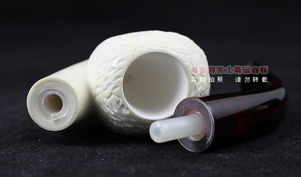 海泡石(meerschaum) 德语“海泡沫”的意思,传说是由海浪头的白沫凝成.海泡石是一种珍贵的多孔矿物,主要成分为含水硅酸镁(magnesium silica),是自然界中最具渗透性的物质之一,由数百万年前,海中微生物的躯壳沉积洋底,石化而成。海泡石是一种极轻质,吸收性极佳的特殊天然材料。最优质、最适合用于烟斗制作的海泡石原料,产自土耳其伊斯坦布尔东南约200英里,名为eskisehir的小村庄附近。工人深入地底约400英尺采挖,过程艰辛。经历多重 筛选、去杂工序,并由熟练工匠精心雕琢,方成就做工精致细巧的精品烟斗和烟嘴。
