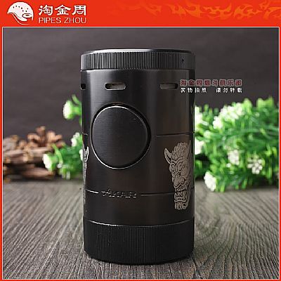 本款为四冲火超大型台式打火机,使用时通过转动顶部的转轮将出火口天窗打开,便开使用,通过转到底部的转轮可以调节气门大小。