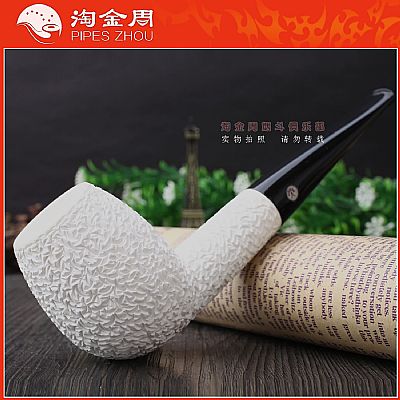 海泡石(meerschaum) 德语“海泡沫”的意思,传说是由海浪头的白沫凝成.海泡石是一种珍贵的多孔矿物,主要成分为含水硅酸镁(magnesium silica),是自然界中最具渗透性的物质之一,由数百万年前,海中微生物的躯壳沉积洋底,石化而成。海泡石是一种极轻质,吸收性极佳的特殊天然材料。最优质、最适合用于烟斗制作的海泡石原料,产自土耳其伊斯坦布尔东南约200英里,名为eskisehir的小村庄附近。工人深入地底约400英尺采挖,过程艰辛。经历多重 筛选、去杂工序,并由熟练工匠精心雕琢,方成就做工精致细巧的精品烟斗和烟嘴。