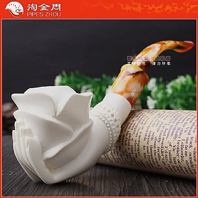 海泡石(meerschaum) 德语“海泡沫”的意思,传说是由海浪头的白沫凝成.海泡石是一种珍贵的多孔矿物,主要成分为含水硅酸镁(magnesium silica),是自然界中最具渗透性的物质之一,由数百万年前,海中微生物的躯壳沉积洋底,石化而成。海泡石是一种极轻质,吸收性极佳的特殊天然材料。最优质、最适合用于烟斗制作的海泡石原料,产自土耳其伊斯坦布尔东南约200英里,名为eskisehir的小村庄附近。工人深入地底约400英尺采挖,过程艰辛。经历多重 筛选、去杂工序,并由熟练工匠精心雕琢,方成就做工精致细巧的精品烟斗和烟嘴。