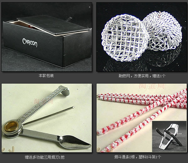 配件:送三用烟刀1把,塑料x斗架1个,过滤芯1包,助燃网1个,通条2根