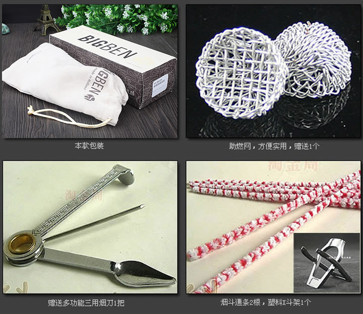 配件:送三用烟刀1把,塑料x斗架1个,过滤芯1包,助燃网1个,通条2根