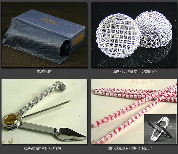 配件:送三用烟刀1把,塑料x斗架1个,过滤蕊1包,助燃网1个,通条2根