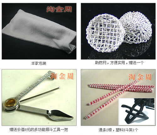 配件:送三用烟刀1把,塑料x斗架1个,过滤蕊1包,助燃网1个,通条2根