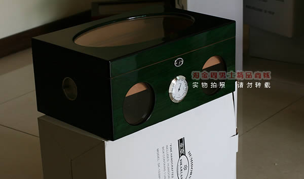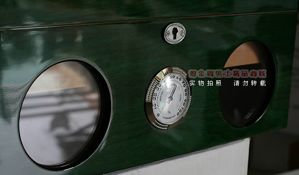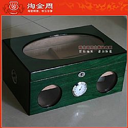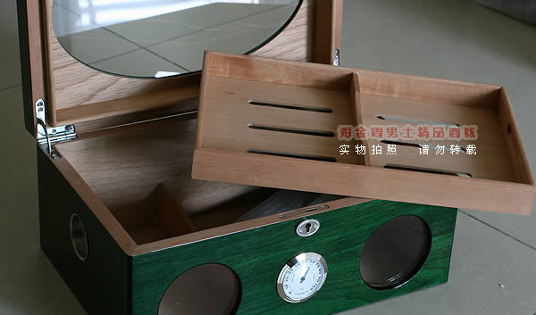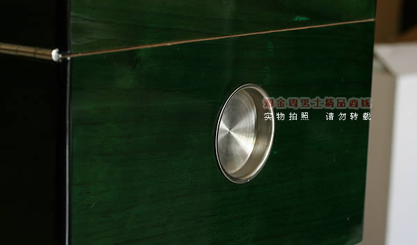 【物品描述】绿色钢琴漆表面,内部由进口西班牙香柏木制成,镀金保湿盒,湿度计,金属合页。圆形提手。