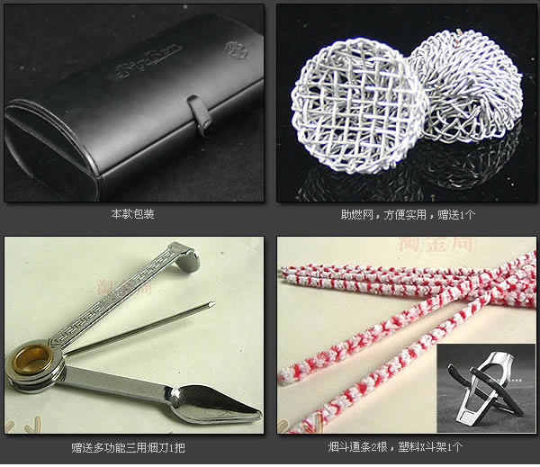 配件:送三用烟刀1把,塑料x斗架1个,过滤蕊1包,助燃网1个,通条2根