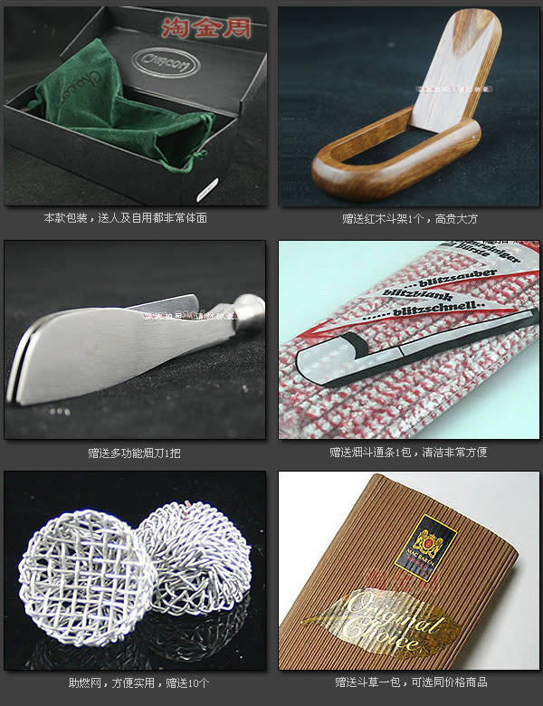 配件:送三用烟刀1把,实木斗架1个,助燃网10个,通条1包,