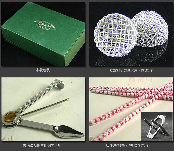配件:送三用烟刀1把,塑料x斗架1个,过滤芯1包,助燃网1个,通条2根