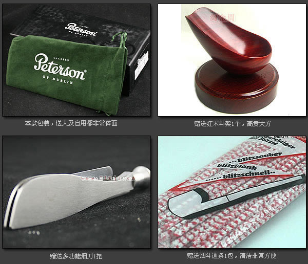 charles peterson当初的发明,一直传承至今。1890年,peterson又研发出革命性的“系统烟斗”(syetem pipe),把烟草燃烧时冷凝下来的多余水汽,收集在特别设计的收集槽中;并配专利设计的斜度烟嘴。“系统烟斗”无疑为烟斗客们提供了空前绝后的干爽吸烟口感。peterson--“the thinking man’s pipe”,流行了一个多世纪,延续至今。