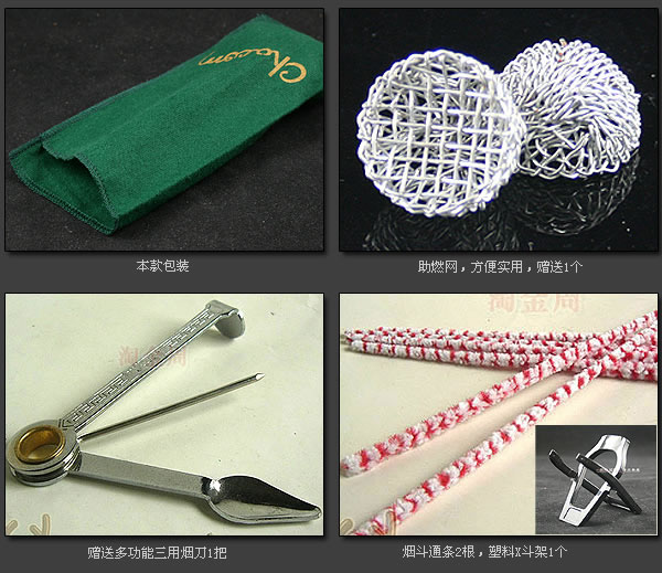 配件:送三用烟刀1把,塑料x斗架1个,助燃网1个,通条2根