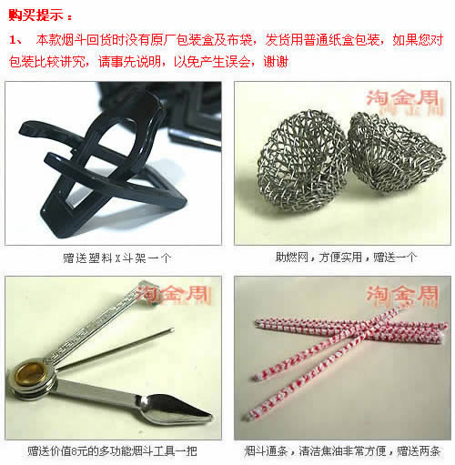 配件:送三用烟刀1把,塑料x斗架1个,过滤芯1包,助燃网1个,通条2根