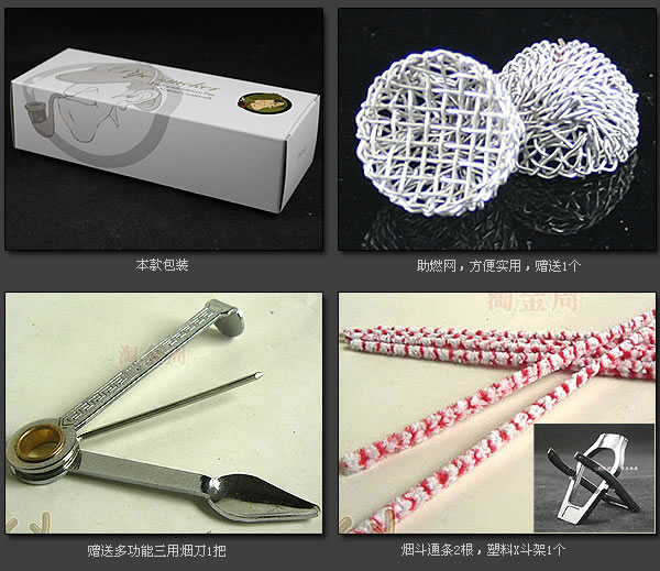 配件:送三用烟刀1把,塑料x斗架1个,过滤芯1包,助燃网1个,通条2根