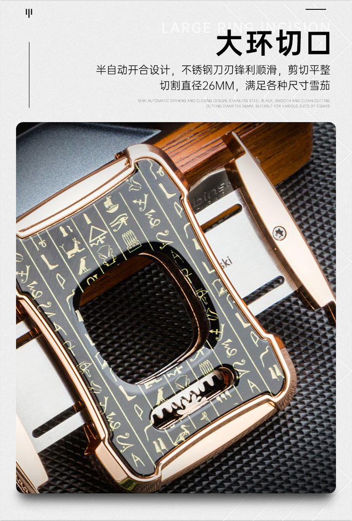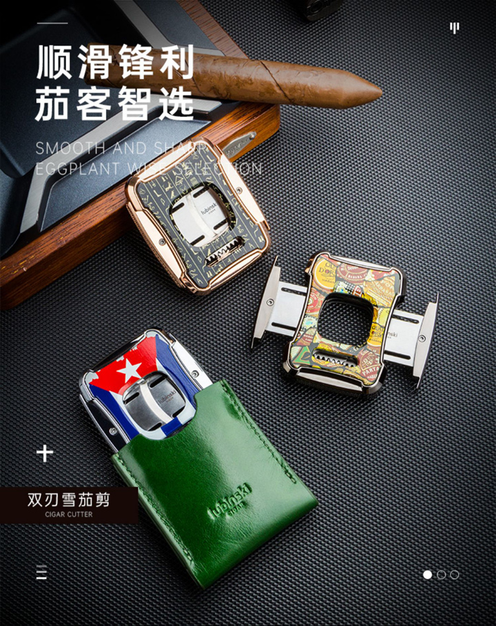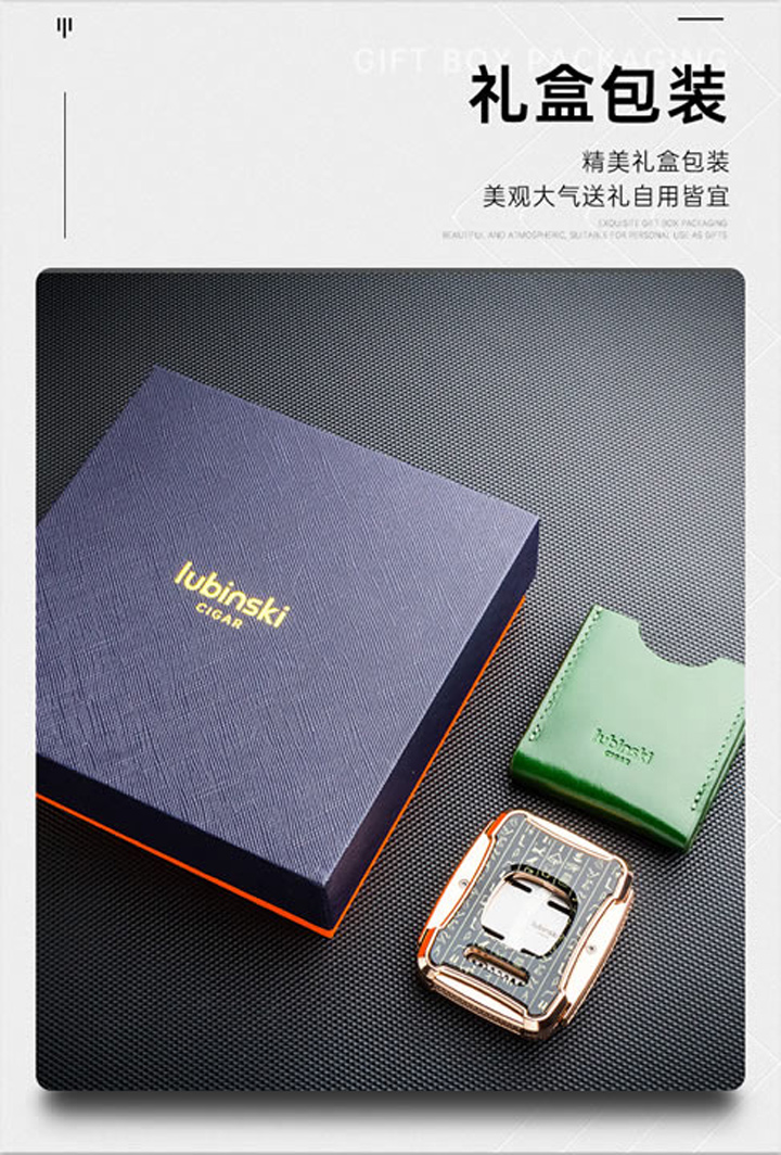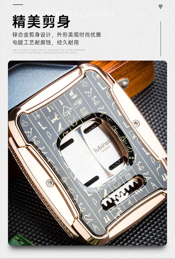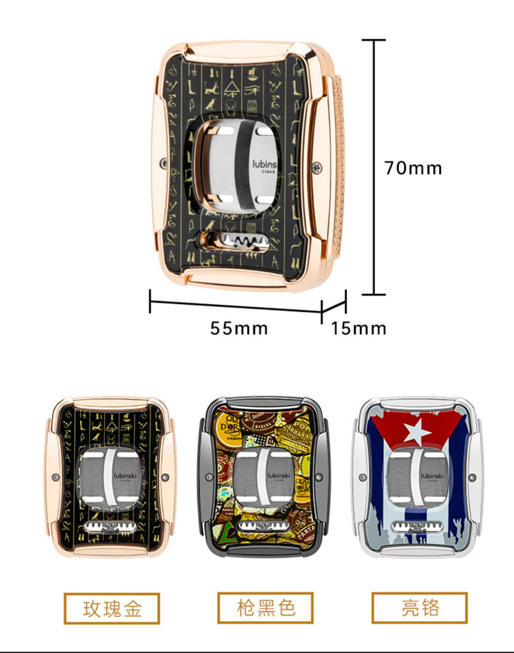 品牌:鲁宾斯基品名:双刃雪茄剪型号:YJA-30031尺寸:70*55*15mm重量:净重160g,毛重370g材质:锌合金/不锈钢颜色:玫瑰金/枪黑/亮铬