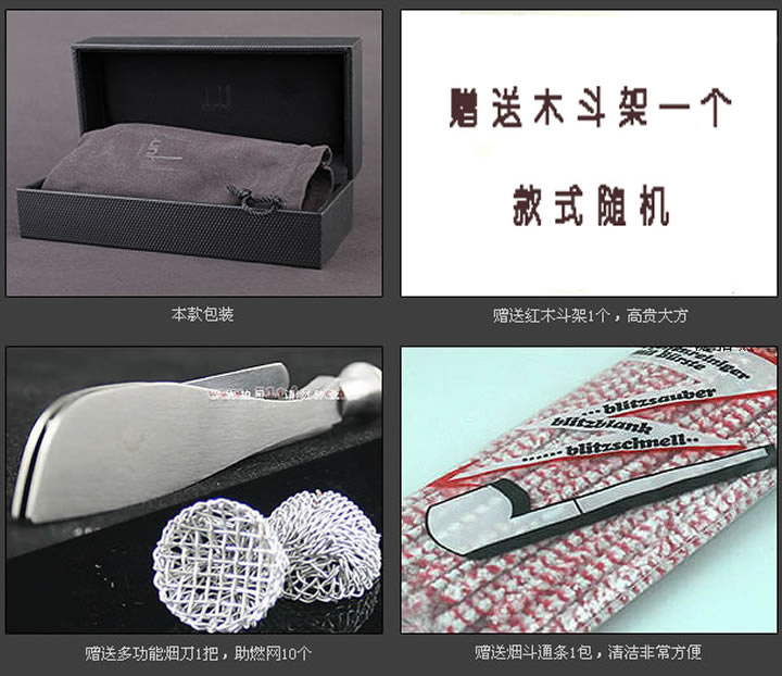 DUNHILL不仅在烟斗方面有出色的设计和制品,在DUNHILL香 烟过滤烟嘴、DUNHILL打火机皮套、DUNHILL雪 茄保湿盒等烟具及许多相关的配件方面也有很多优秀的产品。 这些烟具配件设计精良做工细致精巧,是而且漂亮的礼盒包装也非常有特色!是现今爱好者爱不释手的必备品。