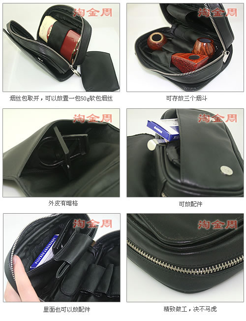烟斗客的必备 可以容纳3把烟斗,内层很多插袋可以放烟丝,包身的小内袋可将烟斗所需用各种配件收藏其内(打火机、修炭器、晶石、烟斗三用具等等)。包面还有个翻盖层,拉链收口,可放钥匙、零钱等小物件。本品方便实用,特别利于出行时携带。