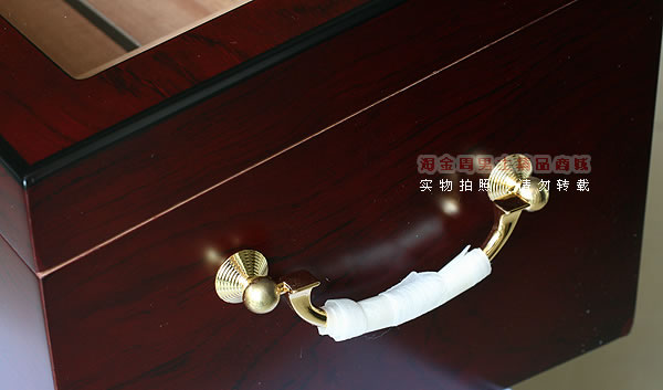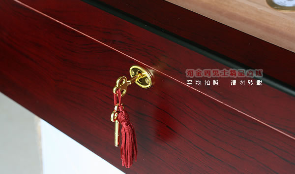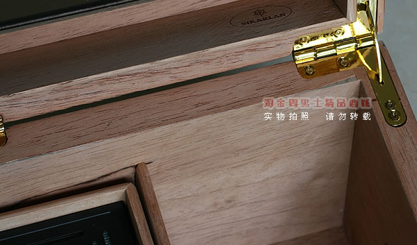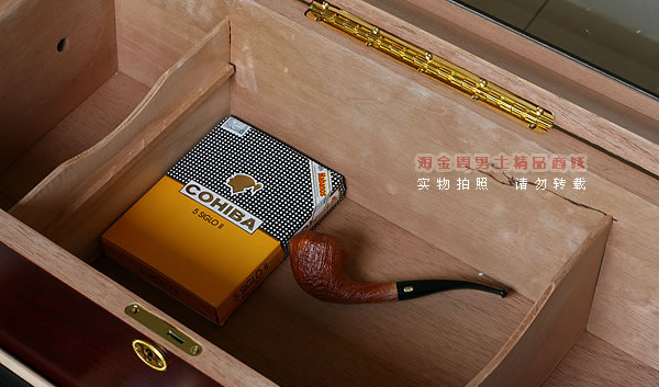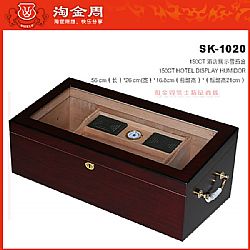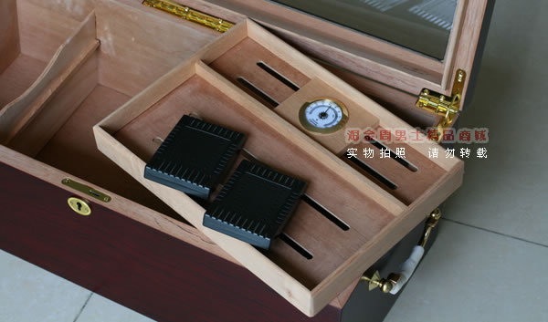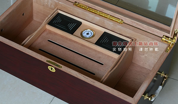 【物品描述】带托盘酒店展示雪茄合,两边及前部顶盖带镀金提手,可装150支雪 茄,带湿度表及保湿合,内部双层结构,表面花梨木,PU亚光。