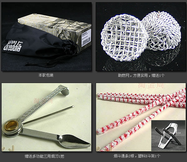 配件:送三用烟刀1把,塑料斗架1个,助燃网1个,通条2根