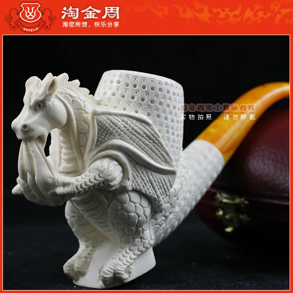 一只雕工讲究的海泡石烟斗,还可以从另一个层面放映出烟斗自身的材质的优劣,显而易见,有通常情况下,一只雕工清湛的烟斗在材质上也应该是上乘的,试想,有谁愿在一块劣质的材料上下那么大的工夫呢?