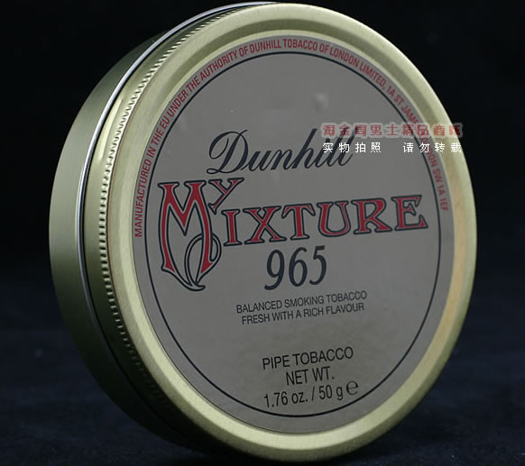 965 为 DUNHILL 最著名的一款调配,原因呢我想是因为每个人都有可能喜欢它,但是会有不同的理由。抽起来有股乌梅味,抽时烟量很大,味道很重.965 不适合新手,在我看来英式调配中 965 较其它更富于变化,抽这一款时选用的烟斗和装烟量都会导致风味不同。随着抽烟者的技巧增加,对享受烟草的认识加深,对965 的感受都是不同的,总的来说这是男人的烟草。