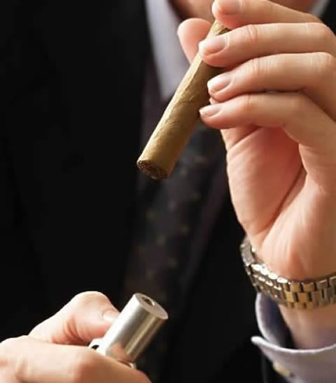 点燃雪茄需要时间与耐心来掌握,首先用左手的拇指握住雪茄上方,另外四个手指轻托雪茄,然后轻轻转动,打火机的火焰均匀地接触雪茄燃火面,当雪茄燃火面充分燃烧,圆周出现一圈细窄的黑边时,雪茄就被点燃了。