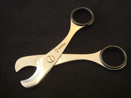 使用方法:一指在上,四指在下握住雪茄剪,剪刀与雪茄呈90度方向,剪掉雪茄帽。