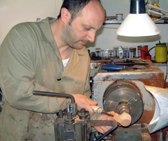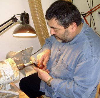 ![]() | Palazzi 很快发现靠他一个人的工作不能满足顾客的需求量,于是他开始寻找一个搭档。 Andrea Pascucci 是 Palazzi 在 Mastro de Paja 工作时认识的。 Pascucci 以前是个酒吧男招待,在 1985 改行做烟斗,他的作品 Palazzi 很喜欢。在 2000 年, Palazzi 问 Pascucci 能否帮他做一些烟斗, Pascucci 接受了他的请求。“我知道他是个聪明人,所以我给了他一些工作,” Palazzi 边说边弄湿石楠块,思考着在上面勾勒出形状,“当我看到他的作品后,我立刻邀请他加入我的公司。” |
