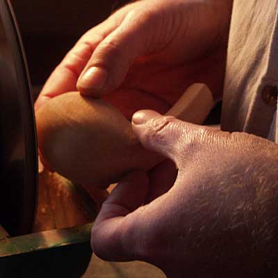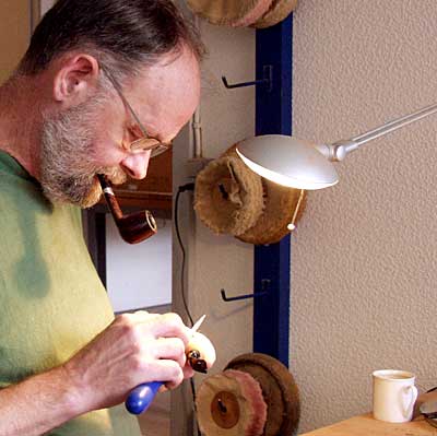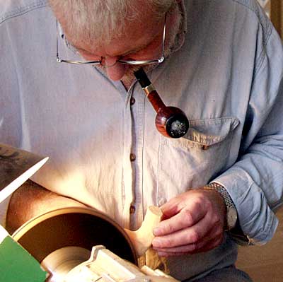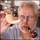 “打个比方来说, Bang不希望我们手工来切割那些准备用来制作喷沙斗的石楠木茎。因为如果不是手工切割的话,我们可以制作更多的用来制作烟斗的根茎。但是我和 Hanse并不喜欢这样。”在 Holm那里工作时,这两个烟斗大师并没有受到特别的限制,什么是可以做的,什么是不可以做的。但是在邦这里,一个负责机器制作,一个则负责加工的过程。所以,从制作烟斗的开始到结束,他们都非常想精益求精。“我们似乎对每样事情都在抱怨,但是有时会把 Bang 弄的不开心。” Hanse 说道。但是 Bang 似乎不赞成这两个制作大师花如此多的精力在一个烟斗的制作工序上,他更为看重的是他的烟斗在世界上的知名度以及他的烟斗品牌的受人尊敬程度。 我们并不清楚这些烟斗是多么的受人尊敬“ Hanse 说道。我们只是尽自己的能力去制作最好的烟斗,并不求烟斗客们的感激和回报。 |   |