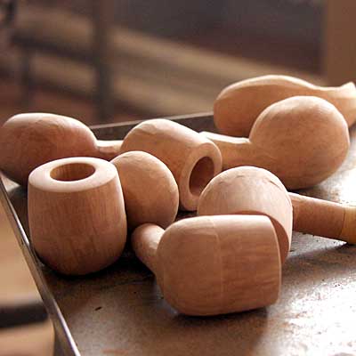 | 由这样的茎制作出来的斗口感更好。烟斗的形状和钵体都是多变的。但是两位大师都是根据一定的规则和标准来选择钵体和设计烟斗的。在他们的眼里,烟道直径为 4 毫米是最为适宜的。“ 4毫米的直径适合大多数的烟斗客,包括我们自己。”韩森这样说道。 在制作 Bang的烟斗过程中花费时间最多的是烟斗的最后几个步骤,通常会花费全部制作过程的一半时间甚至更多。 |  |