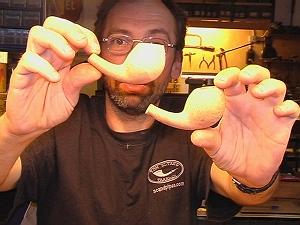 ELTANG 说:“我非常清晰的记得那幅照片,照片上印有很精美的烟斗和一些陪衬的谷物。但是很遗憾,我没有能保留当时的那本杂志。但是我当时看到的感觉就是烟斗很适合我的性格,如果我能亲手制作烟斗,那会是件很棒的事情。于是,我当时就暗下决心:我长大了要作一名烟斗匠。” ELTANG 的确那么做了,甚至还没有等他长大。他在 11 岁的时候,在一次交通事故中摔断了腿,在他需要找些事情来消磨康复时间的时候,一个亲戚从 PIPEDAN 那里给他买来了一块事先钻好孔的石楠块与一支烟斗吸杆。就这样, ELTANG 完成了他的第一个烟斗。后来, ELTANG 从一个叫FLEMMING 的烟斗匠那里学到了更多关于烟斗制作的知识。他们是在 ELTANG 放学后的路上遇到的, FLEMMING专门帮助那些喜欢烟斗制作的年轻人进入烟斗制作的圈子,他们的相遇似乎是上天的安排。 |